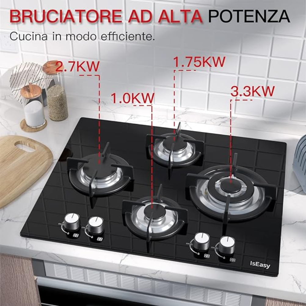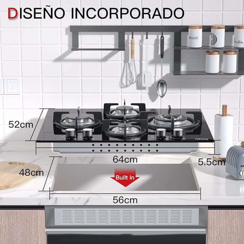 La Placa de Gas 4 Fuegos Gas Natural/Propano Encimera IsEasy es un electrodoméstico diseñado para aquellos que buscan eficiencia y funcionalidad en su cocina. Ideal para familias o aficionados de la gastronomía, esta encimera permite la cocción simultánea de varios platos, optimizando así el tiempo en la cocina.